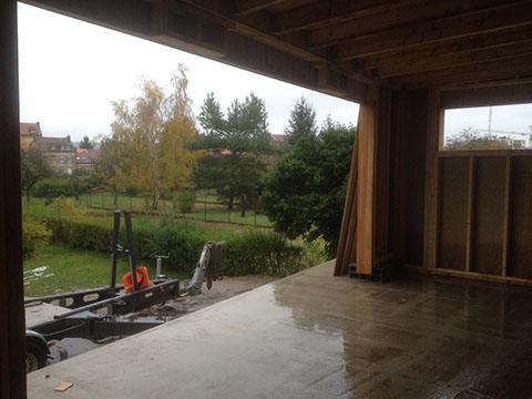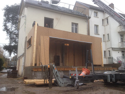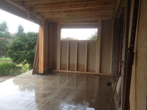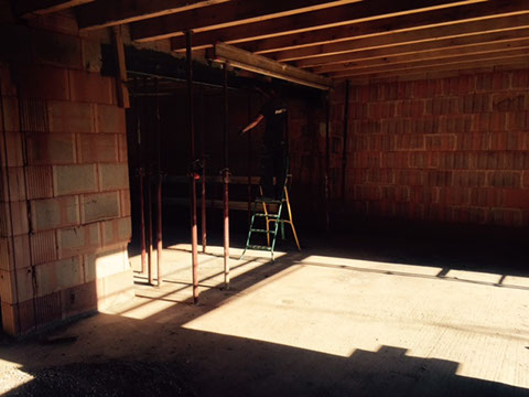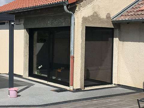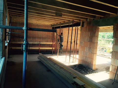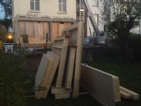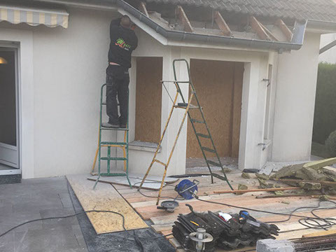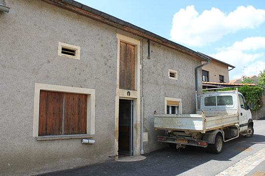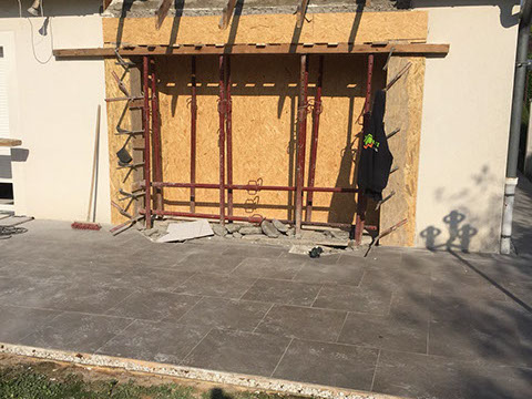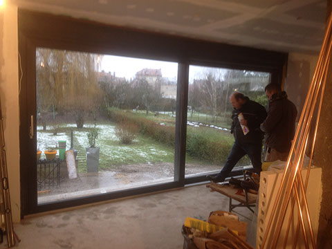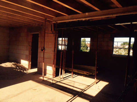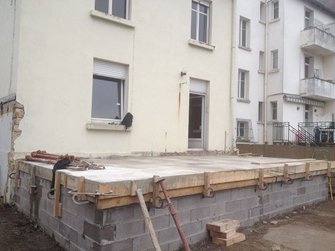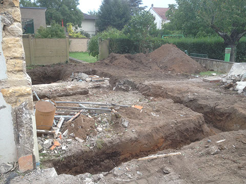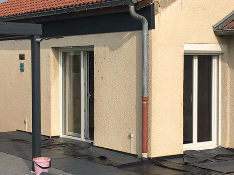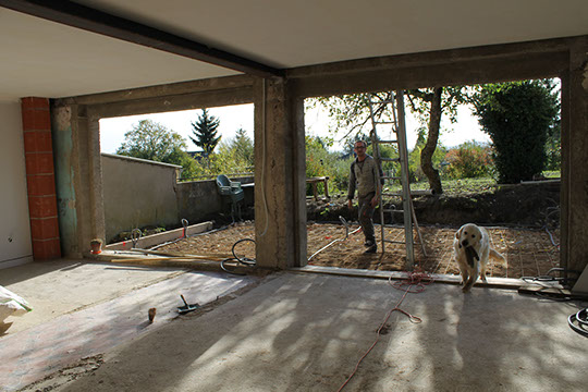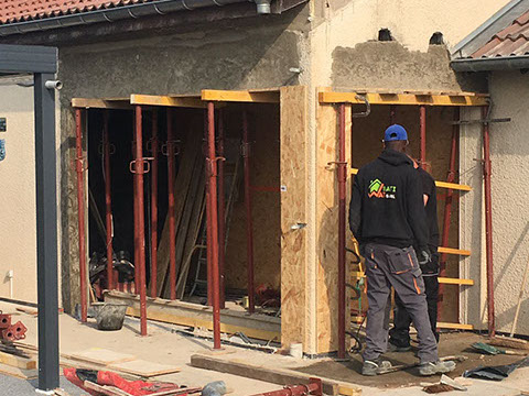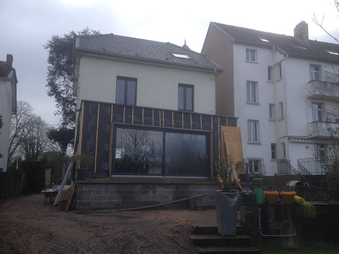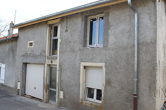 Rénovation complète d’une maison lorraine : Drainage, réalisation d’ouverture dans façade arrière pour baies vitrées avec réalisation d’une fondation, de 2 poteaux en béton armée avec feuillure et un linteau avec caisson pour volets roulants.