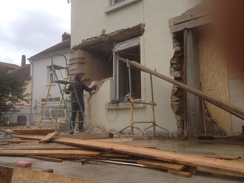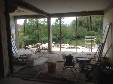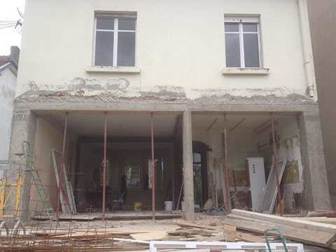 Rénovation d’une maison des années 30 avec création de plusieurs ouvertures dans murs porteurs avec pose de HEA et poteaux en acier + Agrandissement avec ouverture dans la façade arrière avec 1 poteau en béton armé.